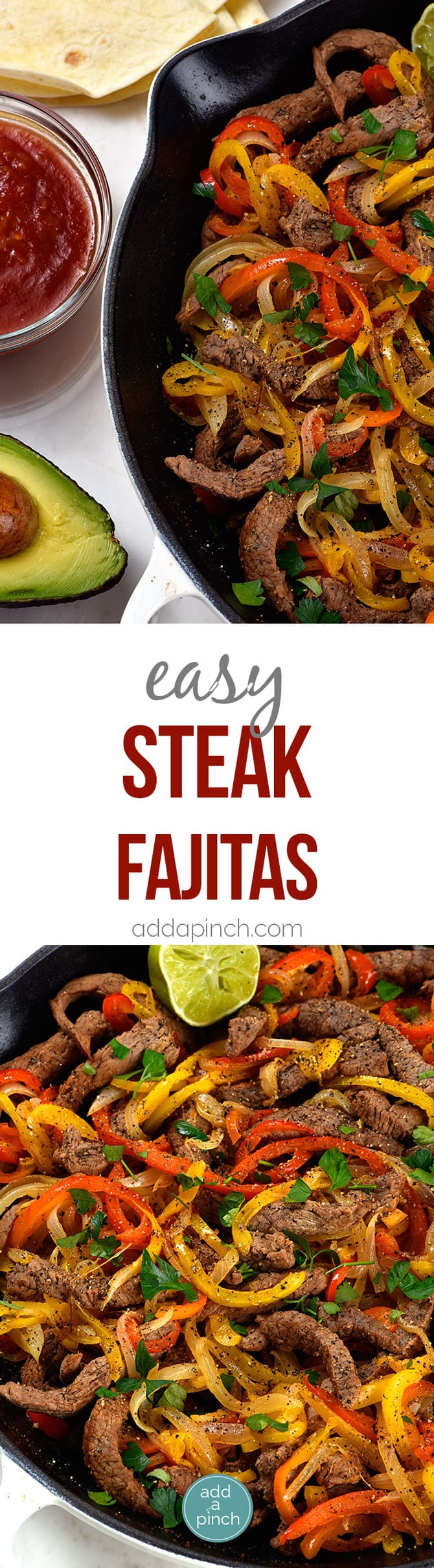 Steak Fajitas Recipe – Steak fajitas make a quick and easy meal perfect for weeknight suppers or weekend celebrations! Made with beef, peppers, onions and served with a stack of warm tortillas and condiments. They are always a favorite!
